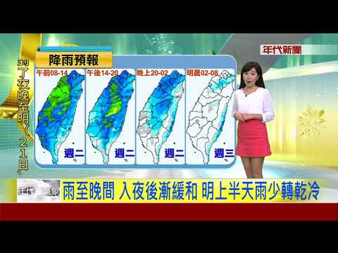 今(20日)全台慎防雷與發生,氣象局特別針對台南及高雄發布大雨特報,民眾外出記得攜帶雨具,注意行車安全。今日下半天開始氣溫下降,明天起轉為乾冷天氣型態,冷氣團將影響至週五(23日),最低溫下探11度,週六後升溫回暖。
