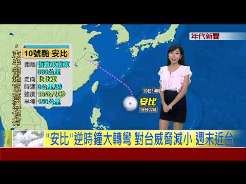 今年第10號颱風"安比"昨晚生成,目前持續朝東北方前進,預計明天轉向西北,對台威脅小,但周末是最接近台灣的時候,欲前往琉球的民眾要多加注意颱風資訊。今天氣與昨日雷同,西半部晴朗炎熱,東半部需慎防午後雷陣雨,雲嘉屏地區降雨機率60%,外出記得攜帶雨具,週末受颱風外圍環流影響降雨區擴大至北部,全台天氣不穩,還請把握這兩天的好天氣。