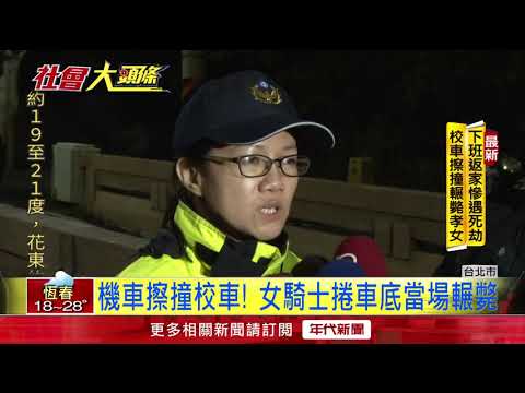 8號晚間6點半左右,台北市自強隧道口發生一起死亡車禍,當時23歲林姓女騎士正要回家,沒想到剛出隧道打了方向燈要左轉,卻遭到後方校車擦撞,女騎士跌落後整個人被捲進車底,當場遭到輾斃,而這肇事車輛竟還是知名貴族學校校車,事發後車上學生已經由其他校車載離現場。